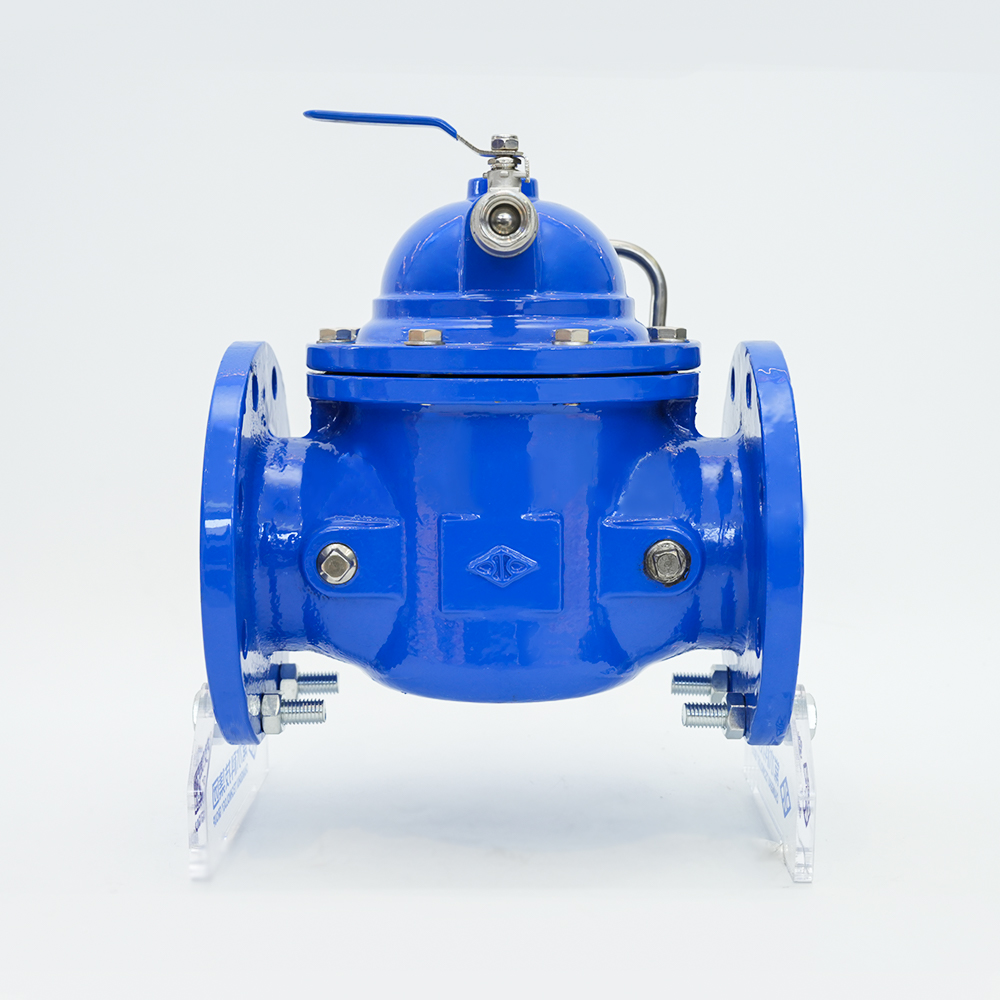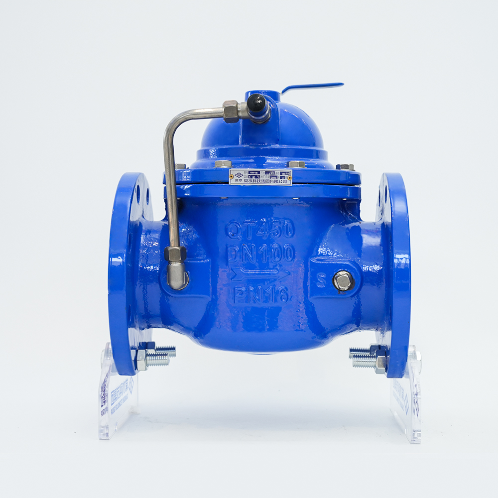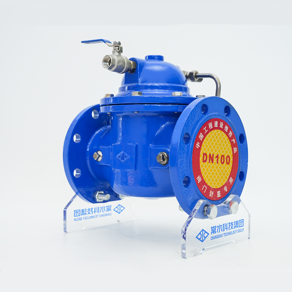 Hydrauliczny zawór sterujący to zawór sterowany ciśnieniem wody. Składa się z zaworu głównego i dołączonego do niego przewodu, zaworu pilotowego, zaworu iglicowego, zaworu kulowego i manometru. W zależności od przeznaczenia, funkcji i miejsca zastosowania może ewoluować w zdalnie sterowane zawory pływakowe, reduktory ciśnienia, wolnozamykające zawory zwrotne, zawory sterujące przepływem, ciśnieniowe zawory nadmiarowe, hydrauliczno-elektryczne zawory sterujące itp. Hydrauliczne zawory sterujące dzielą się na membranowe i tłokowe. Zasady ich działania są takie same. Zasilane są przez różnicę ciśnień SP pomiędzy przepływem przed i za zaworem i są sterowane przez zawór pilotowy, dzięki czemu membrana (tłok) działa hydraulicznie różnicowo i jest całkowicie automatycznie regulowana przez hydraulikę. Główny dysk zaworu jest całkowicie otwarty, całkowicie zamknięty lub w stanie regulowanym. Kiedy woda pod ciśnieniem wpływająca do komory sterującej nad membraną (tłokiem) jest odprowadzana do atmosfery lub znajdującego się za nią obszaru niskiego ciśnienia, wartość ciśnienia działająca na dolną część grzybka zaworu i poniżej membrany jest większa niż wartość ciśnienia powyżej, w związku z czym główny talerz zaworu zostaje przesunięty do pozycji całkowitego otwarcia; gdy woda pod ciśnieniem wpływająca do komory sterującej powyżej membrany (tłoka) nie może zostać odprowadzona do atmosfery lub do znajdującego się za nią obszaru niskiego ciśnienia, siła działająca na tłok membrany (tłoka). Wartość ciśnienia powyżej jest większa niż wartość ciśnienia poniżej, więc główny dysk zaworu zostanie dociśnięty do pozycji całkowicie zamkniętej. Gdy wartość ciśnienia w komorze sterującej nad membraną (tłokiem) mieści się w przedziale pomiędzy ciśnieniem wlotowym a ciśnieniem wylotowym, główny dysk zaworu znajduje się w stanie regulacji, a jego położenie regulacyjne zależy od efektu sterowania łącznikiem zaworu iglicowego i regulowanego zaworu pilotowego w systemie przewodów. Regulowany zawór pilotowy może otwierać lub zamykać swój własny mały otwór zaworu poprzez ciśnienie wylotowe za zaworem i zmieniać się wraz z nim, zmieniając w ten sposób ciśnienie kontrolowane nad membraną (tłokiem) i kontrolując położenie regulacyjne głównego dysku zaworu.